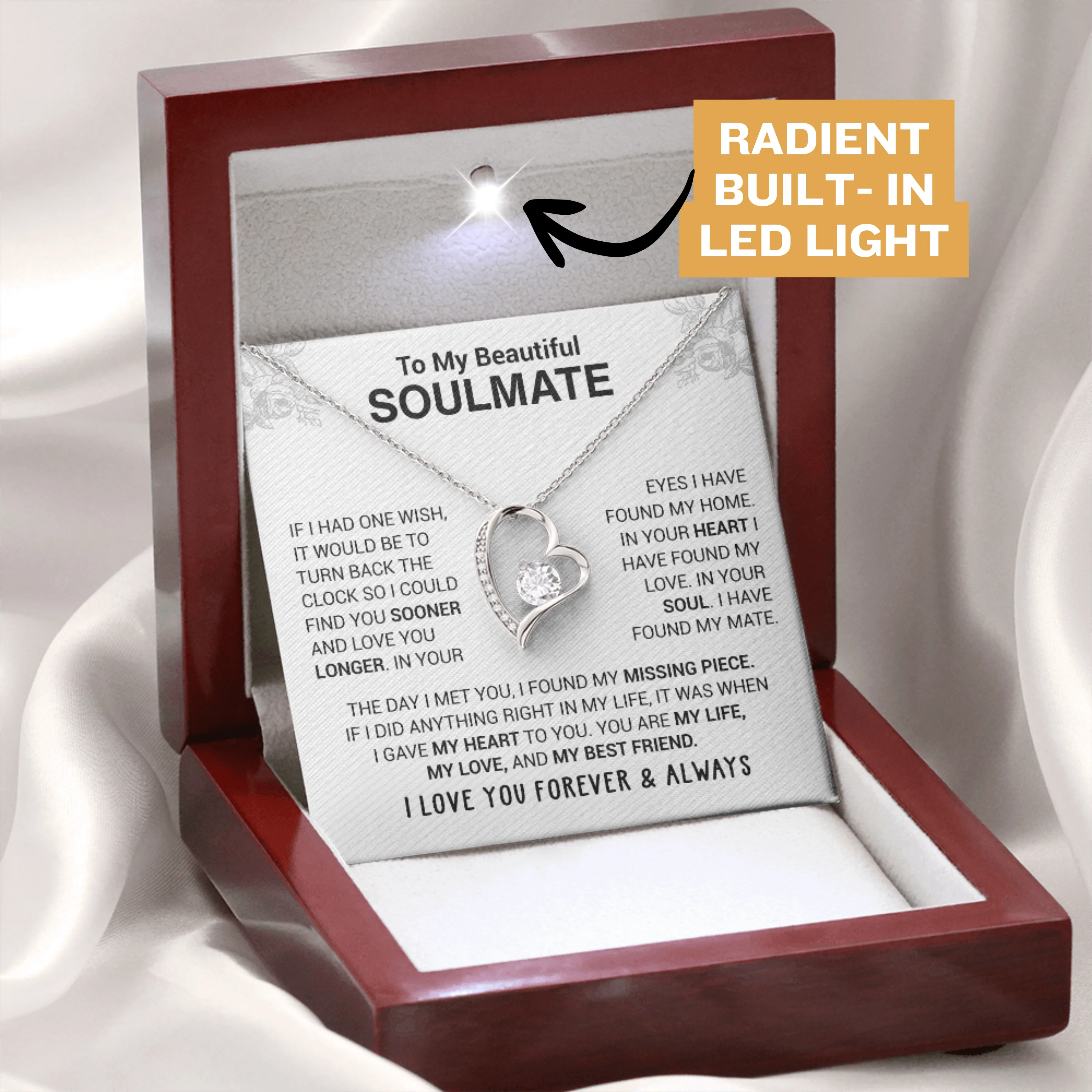 The Message Says:Â “To My Beautiful Soulmate – If I had one wish, it would be to turn back the clock so I could find you sooner and love you longer. In your eyes, I have found my love. In your soul, I have found my mate. The day I met you, I found my missing piece. If I did anything right in my life, it was when I gave my heart to you. You are my life, my love, and my best friend. I love you forever and always.”